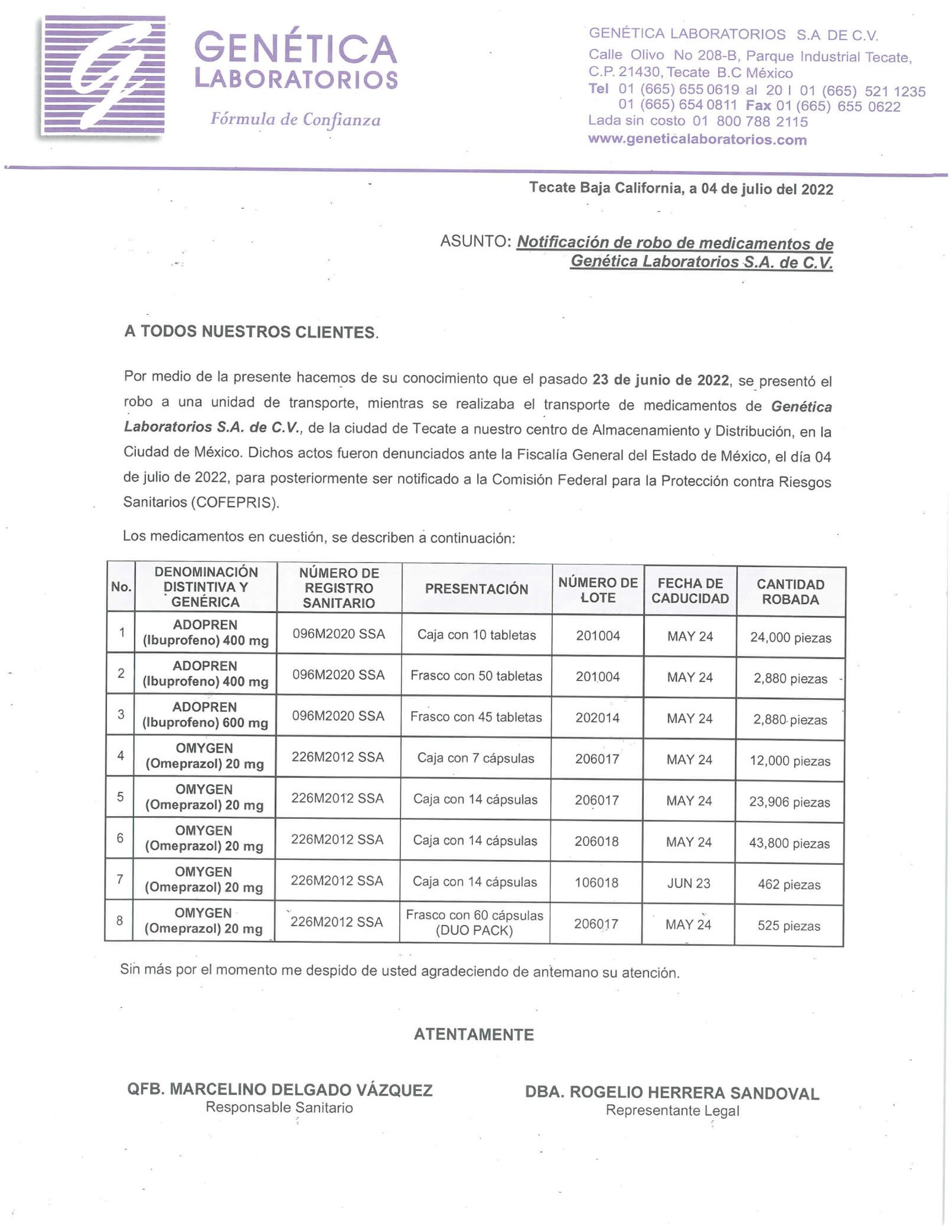 Notificación Robo de MedicamentosNoticiasoctubre 11, 2024 NOTAS RELACIONADAS JULIO 7, 2022Notificación de Robo de MedicamentosOCTUBRE 11, 2024Notificación Robo de Medicamentos